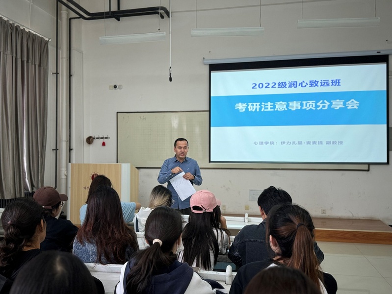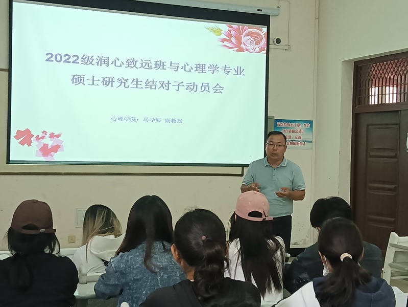 为帮助润心致远班学生尽快了解考研流程、掌握备考技巧,伊力扎提·麦麦提副教授给学生介绍了考研专业分类、心理学与应用心理学专业差异性、各专业需要准备的科目以及如何选择专业等事宜,并鼓励学生坚定考研信心,积极备考,争取考出好成绩。陈瑾副教授对参赛项目、比赛内容、注意事项作了详细介绍,激发2022级润心致远班学生的斗志与激情,为后续的各项赛事吹响号角。马学海副教授在“润心致远班学生与心理学专业硕士研究生结对子”动员会,让润心致远班的学生与心理学专业的硕士研究生结成对子,共同探索心理健康教育的新路径,携手成长。