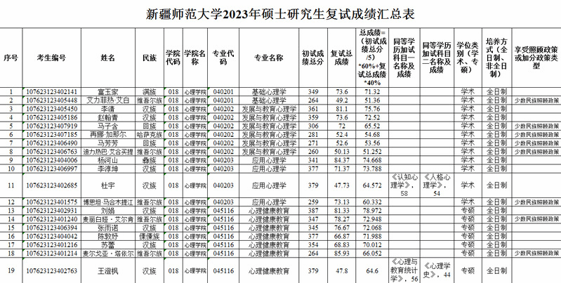 疆师范大学太阳成集团tyc7111cc2023年硕士研究生招生考试第一志愿复试工作已全部结束,现将成绩予以公示。如有异议,请联系研究生招生办公室。 电话: 0991-4110506 电子信箱:598161342@qq.com