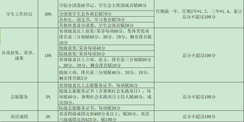 2. 学生工作经历占比30%、各项获奖/荣誉占比10%、志愿服务5%、英语成绩5%,具体细则如下: